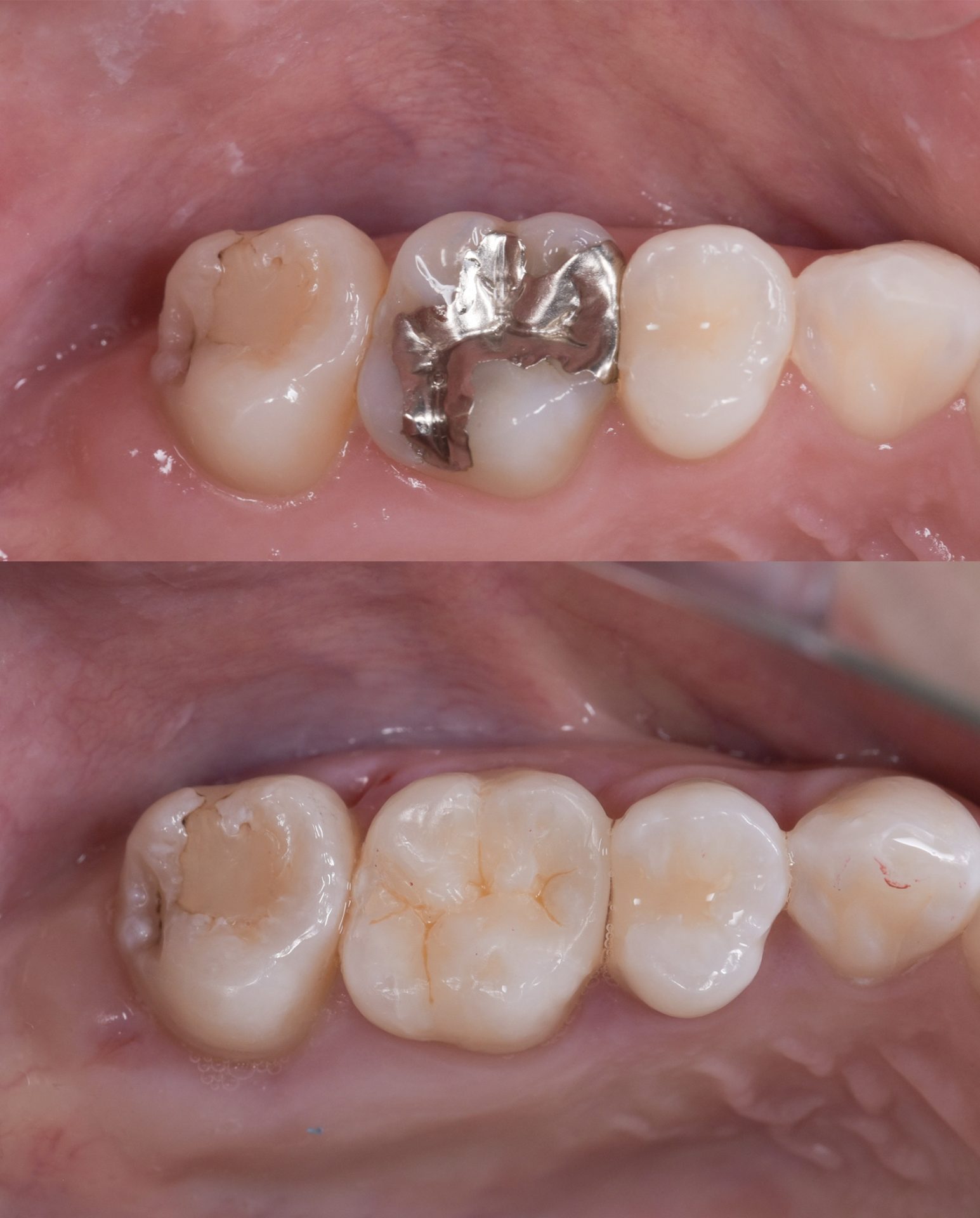 掲載写真は、金属修復(銀歯)を撤去し、ダイレクトボンディングで白い材料に置き換えた前後のイメージです。